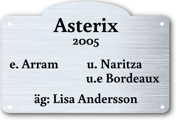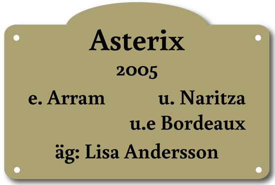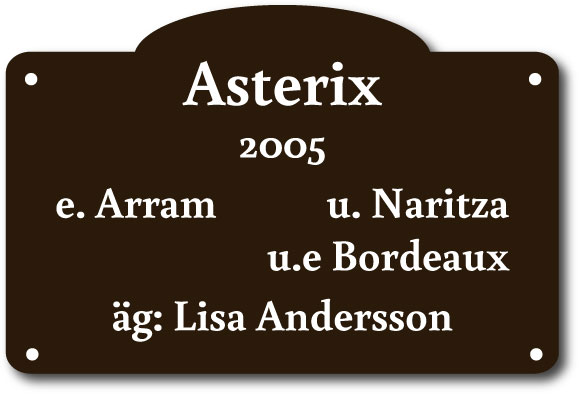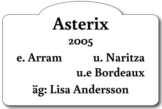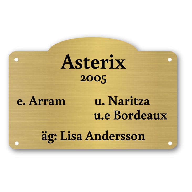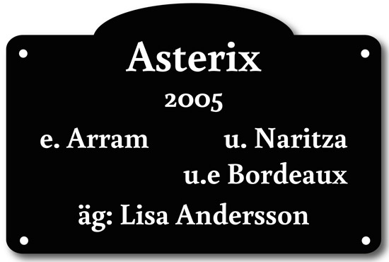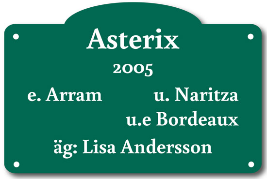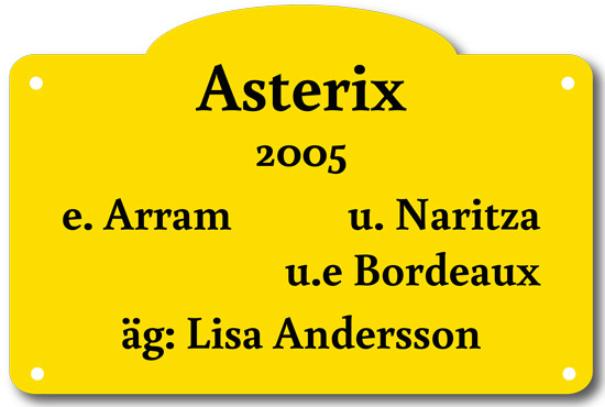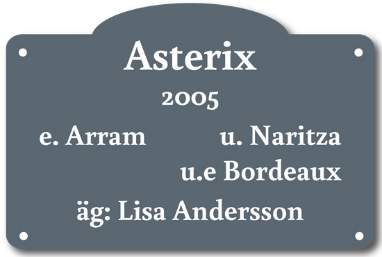 Instruktioner: Ange exakt som du vill att det ska stå på skylten, t.ex. e. framför pappan, Ägare el. äg. framför ägarens namn, årtalet antingen t.ex. 2017 el. 2017-05-25 etc. vill du inte att något ska vara med lämnar du resp. fält tomt. Har du specifika önskemål, ange dessa i meddelanderutan i kassan.