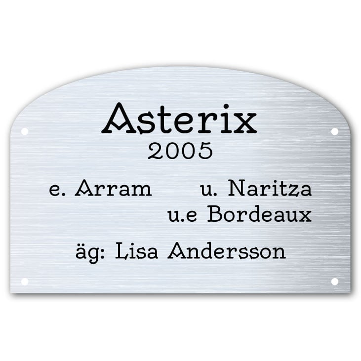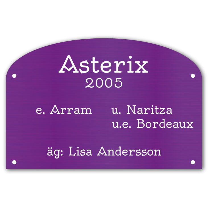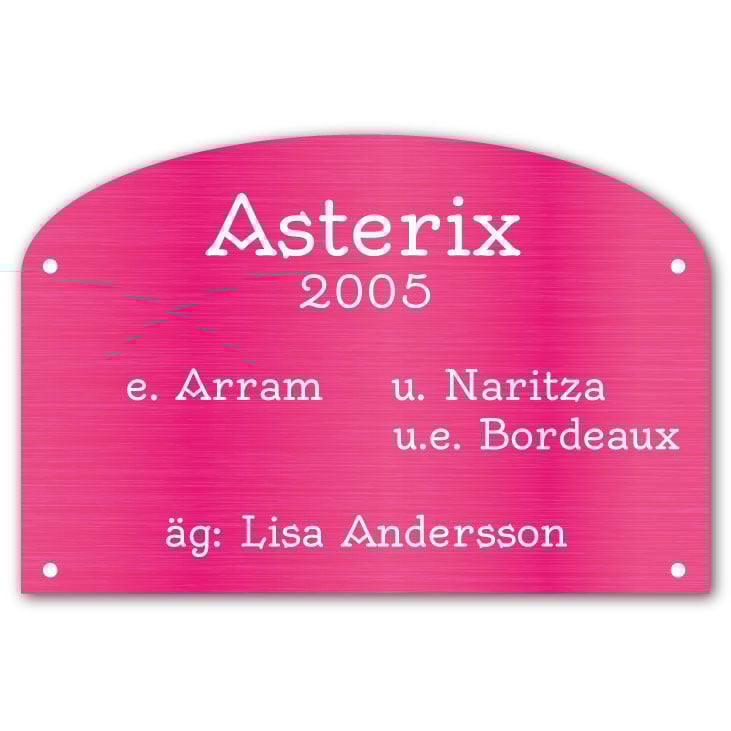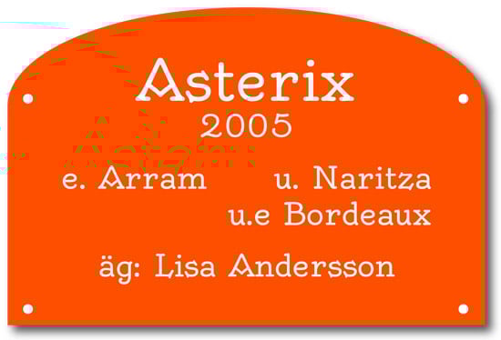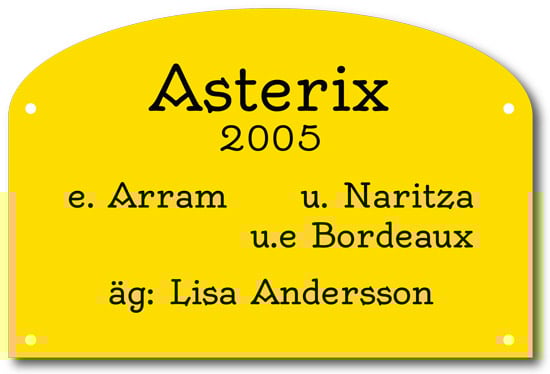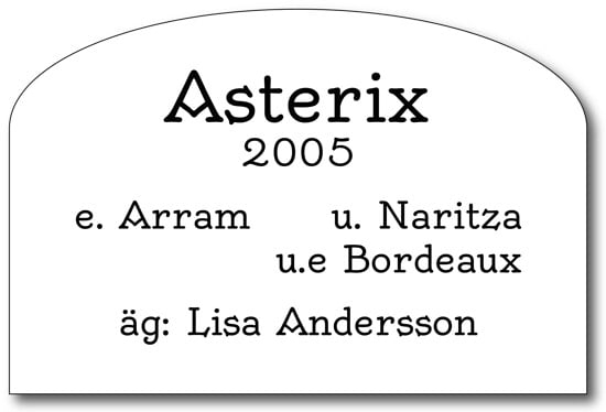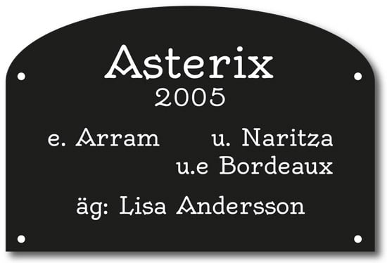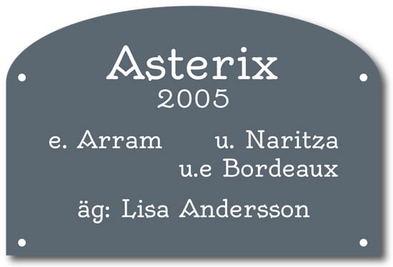 Instruktioner: Ange exakt som du vill att det ska stå på skylten, t.ex. e. framför pappan, Ägare el. äg. framför ägarens namn, årtalet antingen t.ex. 2017 el. 2017-05-25 etc. vill du inte att något ska vara med lämnar du resp. fält tomt. Har du specifika önskemål, ange dessa i meddelanderutan i kassan.