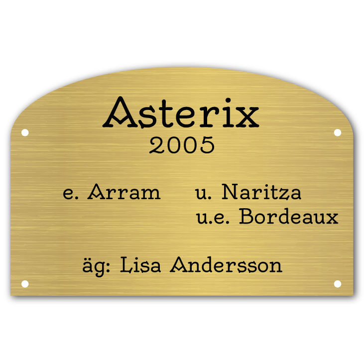 Instruktioner: Ange exakt som du vill att det ska stå på skylten, t.ex. e. framför pappan, Ägare el. äg. framför ägarens namn, årtalet antingen t.ex. 2017 el. 2017-05-25 etc. vill du inte att något ska vara med lämnar du resp. fält tomt. Har du specifika önskemål, ange dessa i meddelanderutan i kassan.