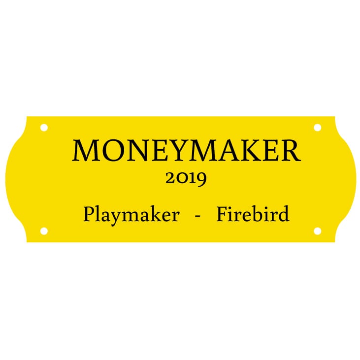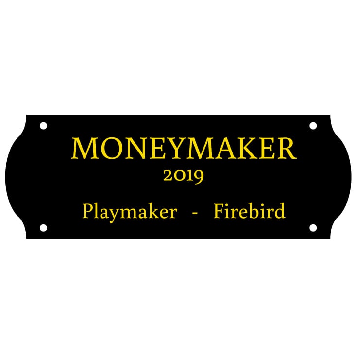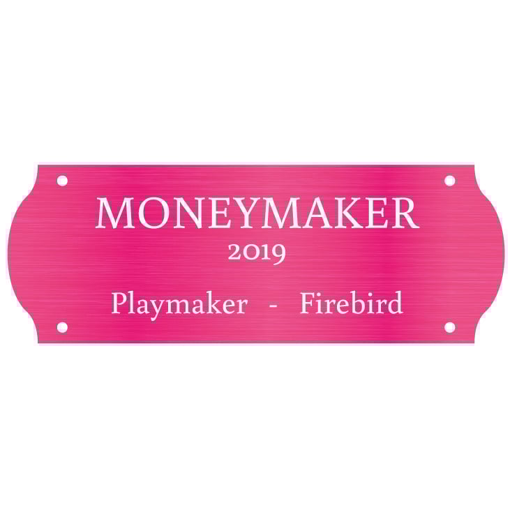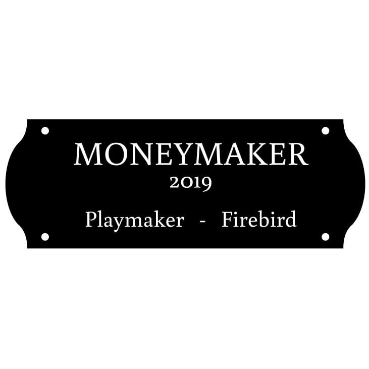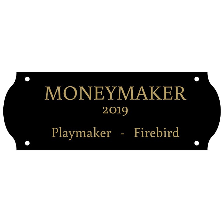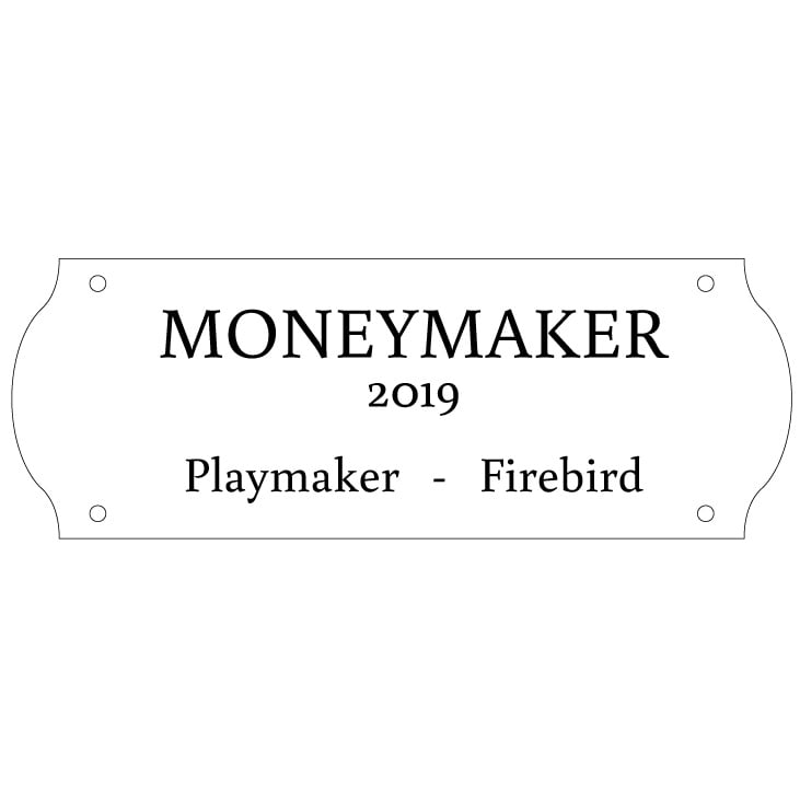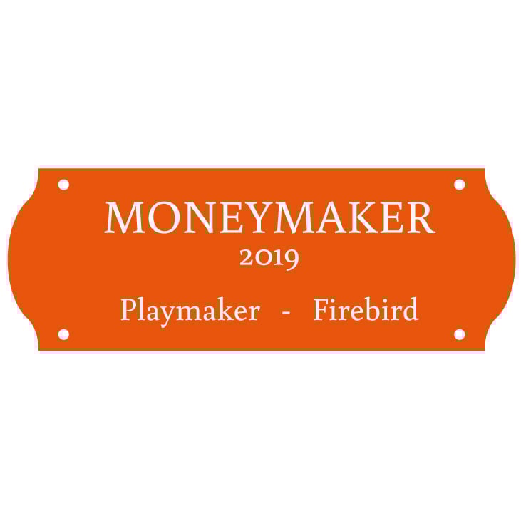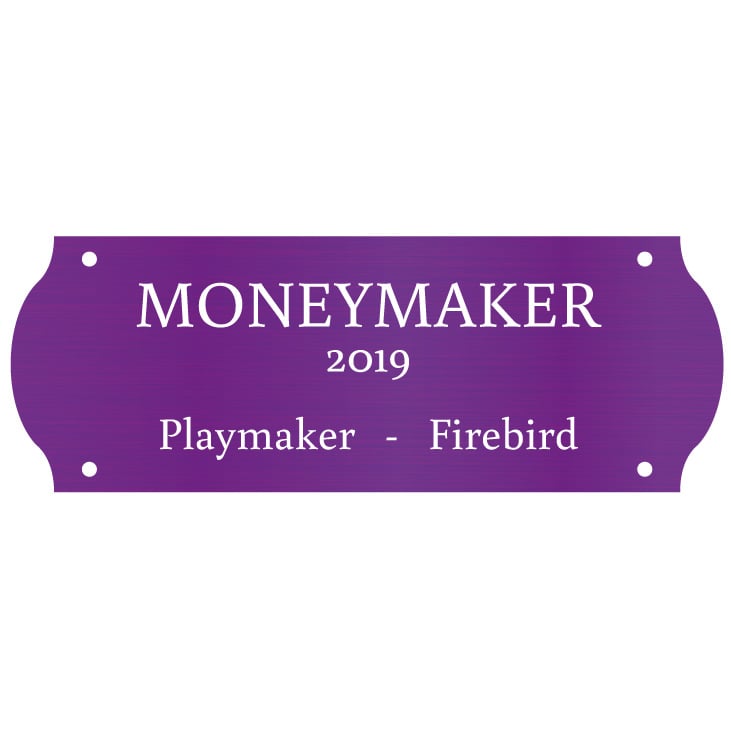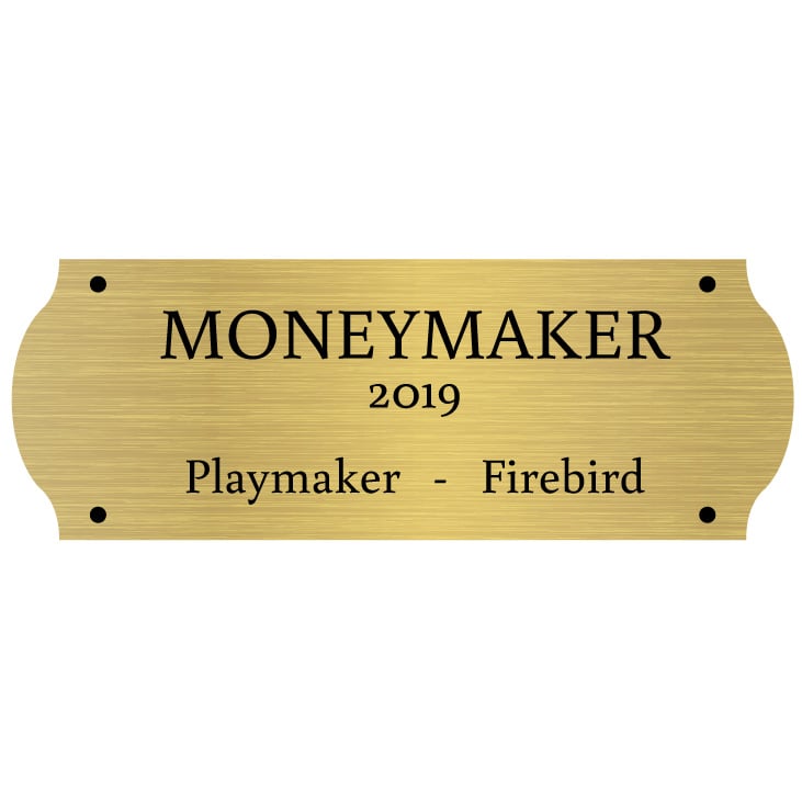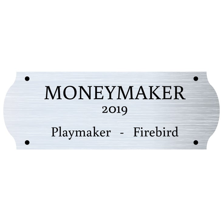 Boxskylt i elegant format, med plats för 3 rader t.ex. namn, årtal och pappa och morfar. Mycket populär skylt som förgyller boxdörren. Välj med eller utan hål för enkel montering.
